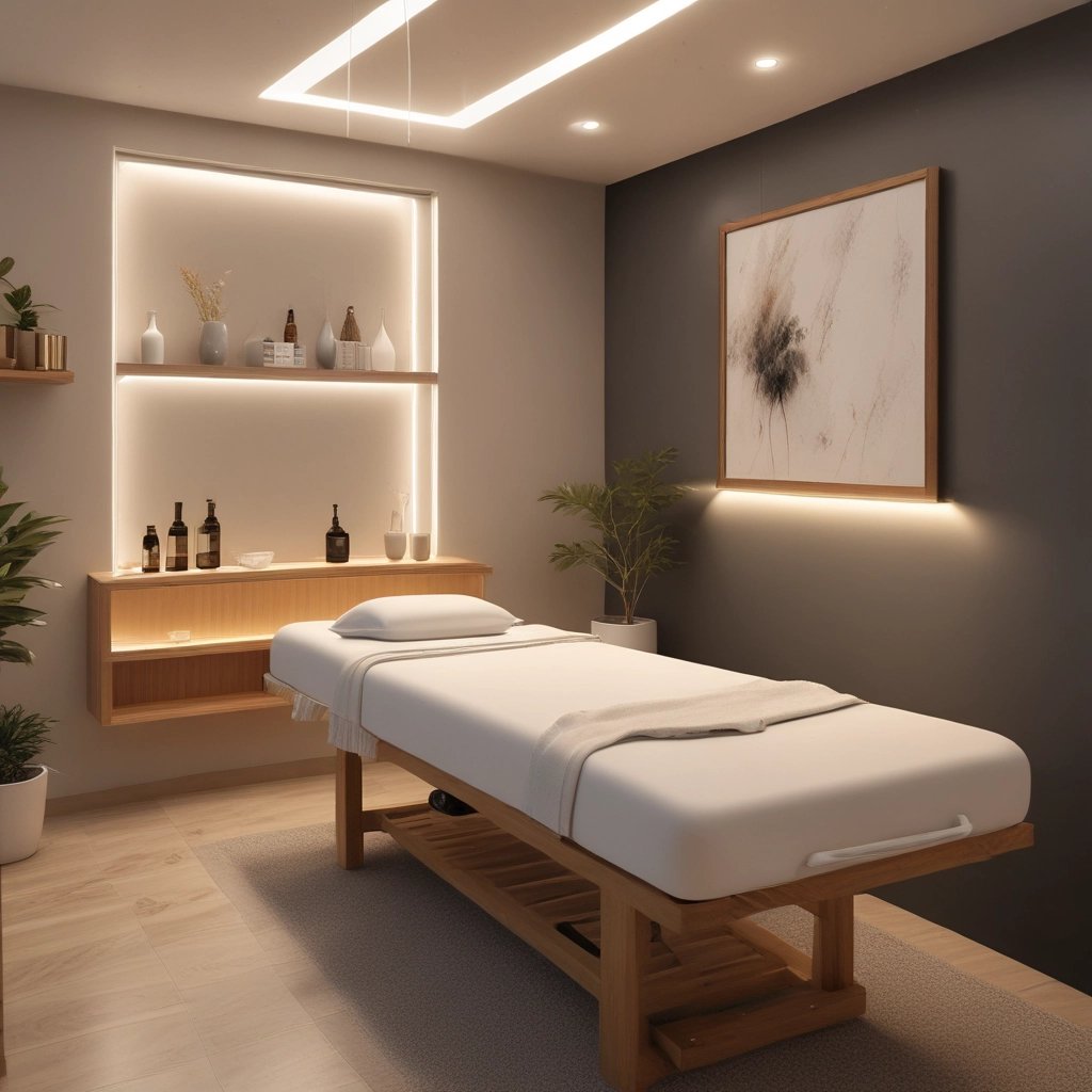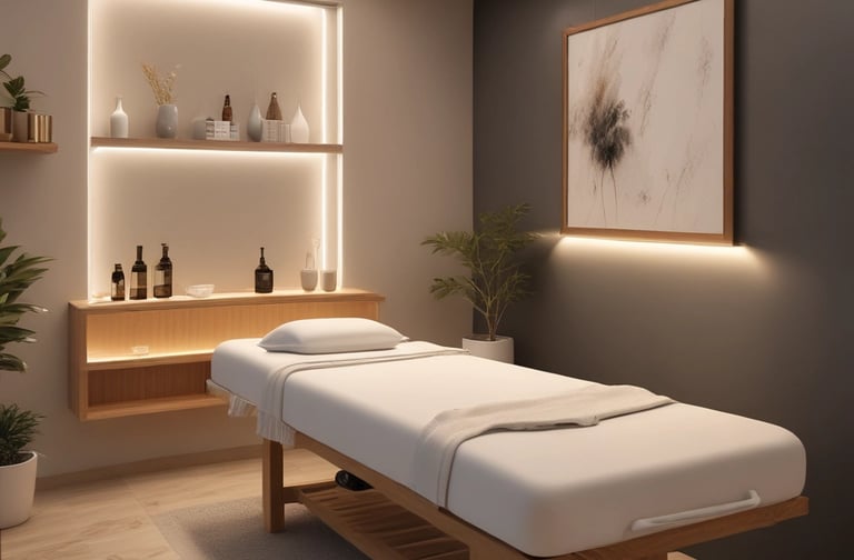 A serene therapy room with soft lighting and a massage table prepared for a session